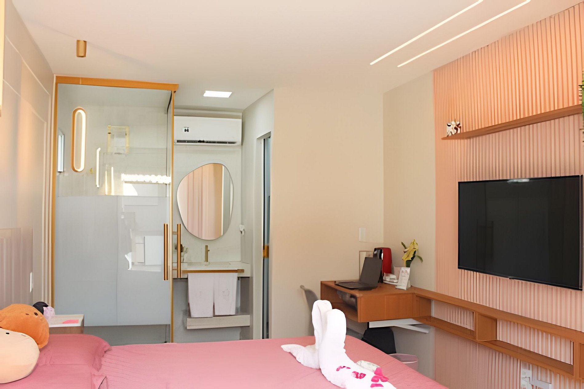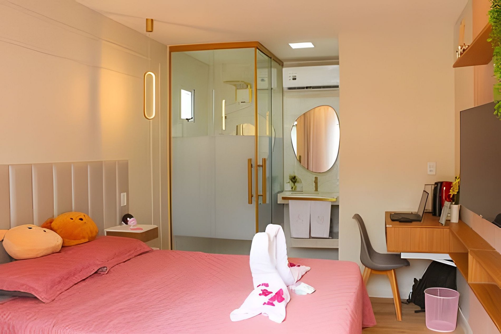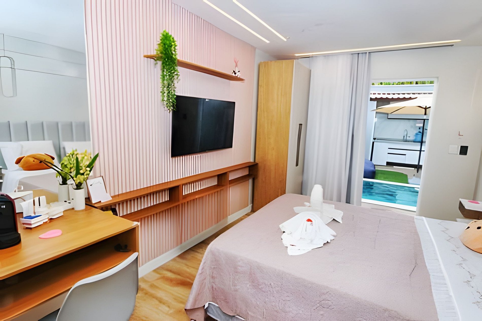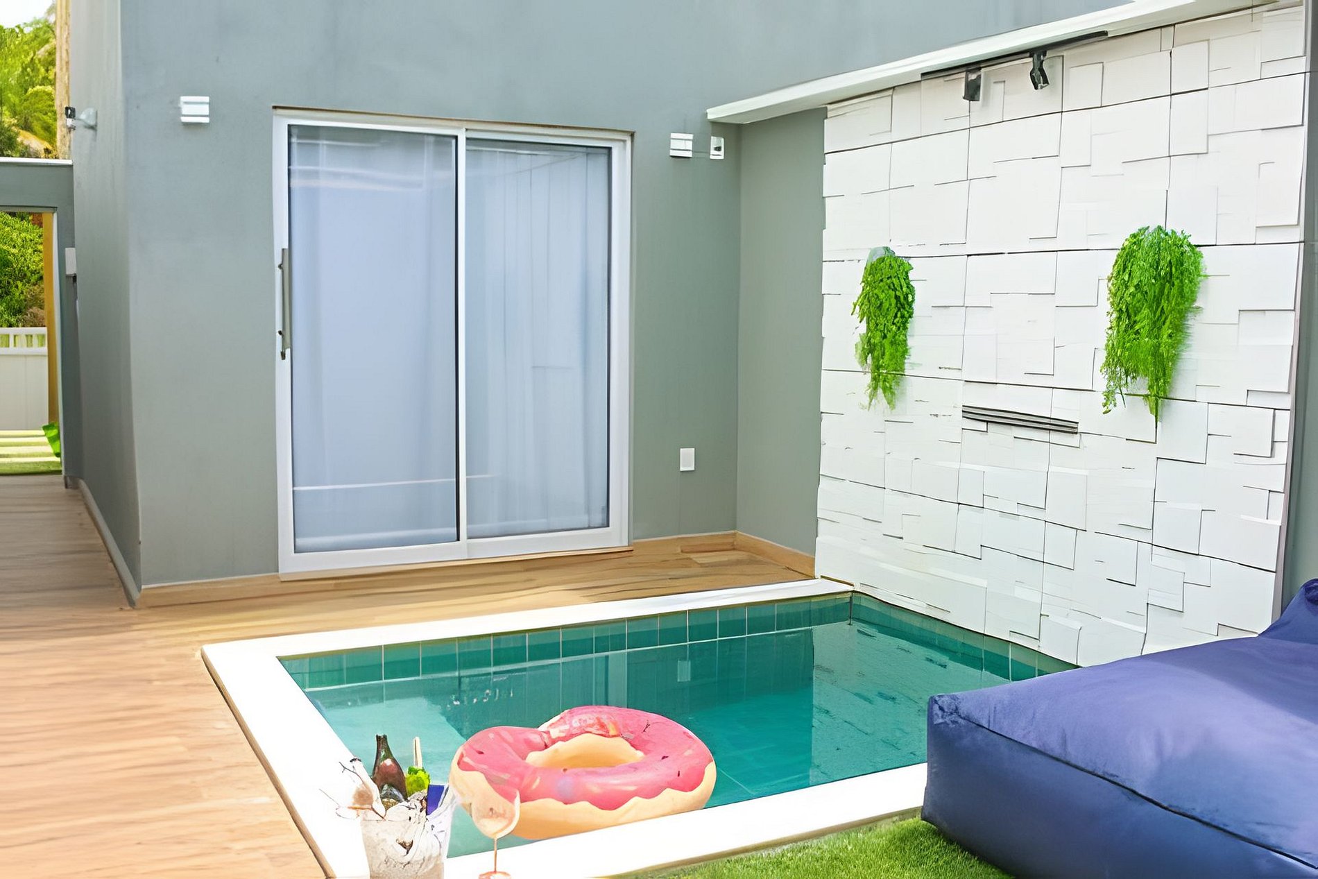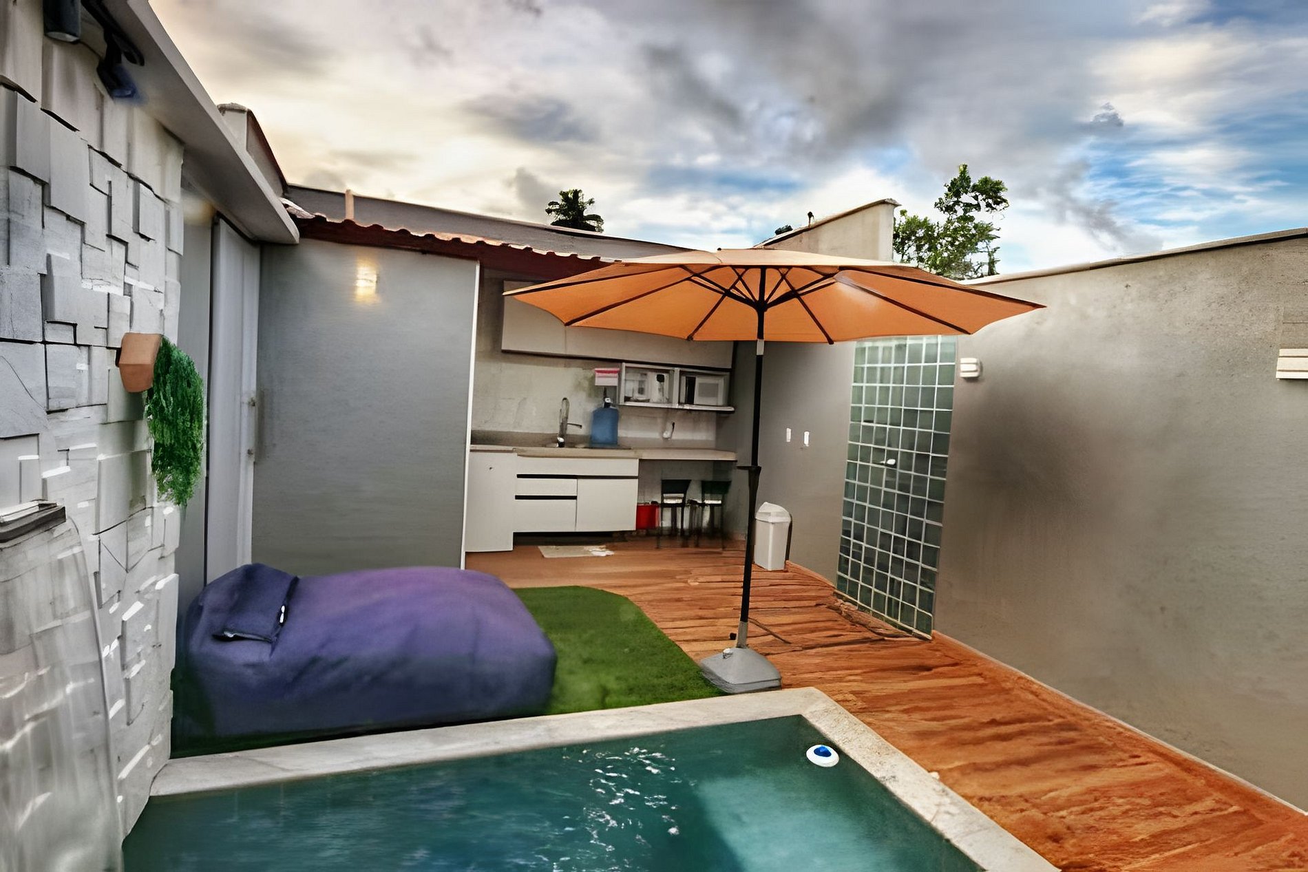 Desfrute de uma suíte com banheiro moderno de conceito aberto, um quintal com piscina privativa, cascata, ducha e espreguiçadeiras, além de uma cozinha totalmente equipada, lavabo e garagem à sua disposição. Todos os espaços são privativos, garantindo sua tranquilidade e conforto durante toda a estadia.